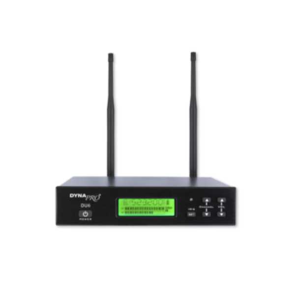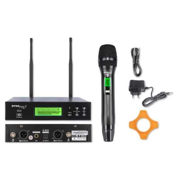 میکروفن بیسیم دستی DYNAPRO U6 از جمله میکروفونها تک کانال پر فروش و حرفهای برند دایناپرو میباشد. میکروفون دایناپرو U6 یک میکروفن وایرلس دارای تک کانال در باند UHF با امکان تغییر فرکانسی می باشد. بر روی LCD نمایشگر دستگاه اطلاعات فرکانسی نمایش داده می شود که قابلیت تغییر فرکانس داشته همچنین نمایش RF یا همان فرکانس رادیویی و AF یا گین صدا را نمایش می دهد.