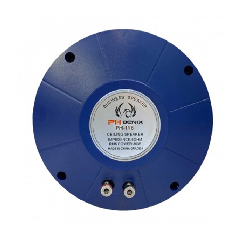 بلندگو سقفی توکار فونیکس PH-116 یک بلندگو توکار TWO WAY از شرکت فونیکس Phoenix است. بلندگوهای سقفی TWO WAY به دلیل داشتن تیوتر و ووفر دارای تفکیک صدایی بالا هستند که فرکانس های پایین از ووفر و فرکانس های بالا از تیوتر پخش میشوند به همین دلیل دارای کیفیت پخش بالا بوده و در مراکزی که نیاز به پخش موزیک و صدا با کیفیت بالا را دارند استفاده میشود.