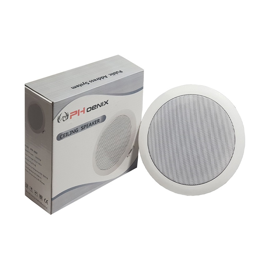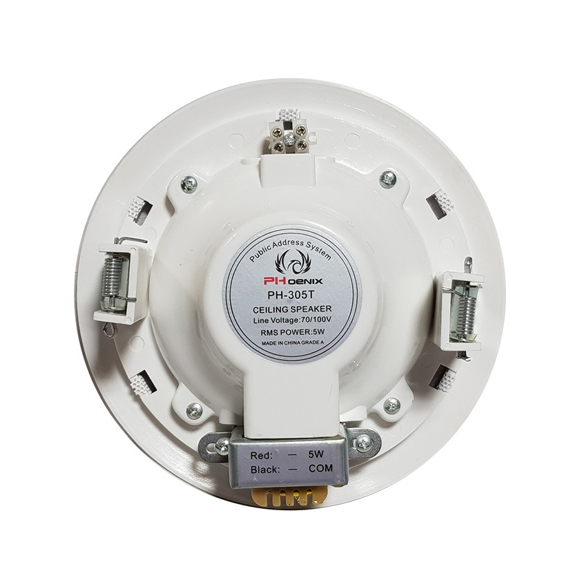 بلندگو سقفی توکار فونیکس PH-305T یک بلندگو توکار فول رنج از کمپانی Phoenix می باشد این باند سقفی با خروجی 5 وات و دارای فرکانس پاسخ گویی بین 90Hz الی 16KHz میباشد و به دلیل ترانس مچینگ امکان استفاده به صورت ولتی اهمی را دارد. اسپیکر سقفی توکار فونیکس PH-305T یک باند سقفی فول رنج (One Way) است.