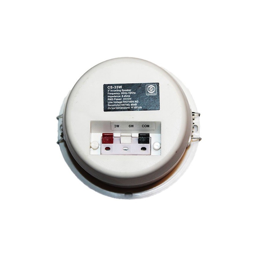 بلندگو سقفی توکار زیکو ZICO CS-33W دارای فرکانس پاسخ گویی بین 95Hz الی 15KHz و حساسیت 88 دسی بل میباشد، همجنین دارای قدرت خروجی 3- 6 وات و ولتاژی برابر با 70 و 100AC میباشد. این اسپیکر دارای ووفر 3 اینچی است.